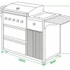Основной гриль на 5 газовых горелок, 1 боковая инфракрасная горелка, Решетка из чугуна, Термометр, встроенный в крышку, Подсветка газовых регуляторов, Два встроенных шкафчика, Ящик для газового баллона, Регулируемые по высоте ножки |